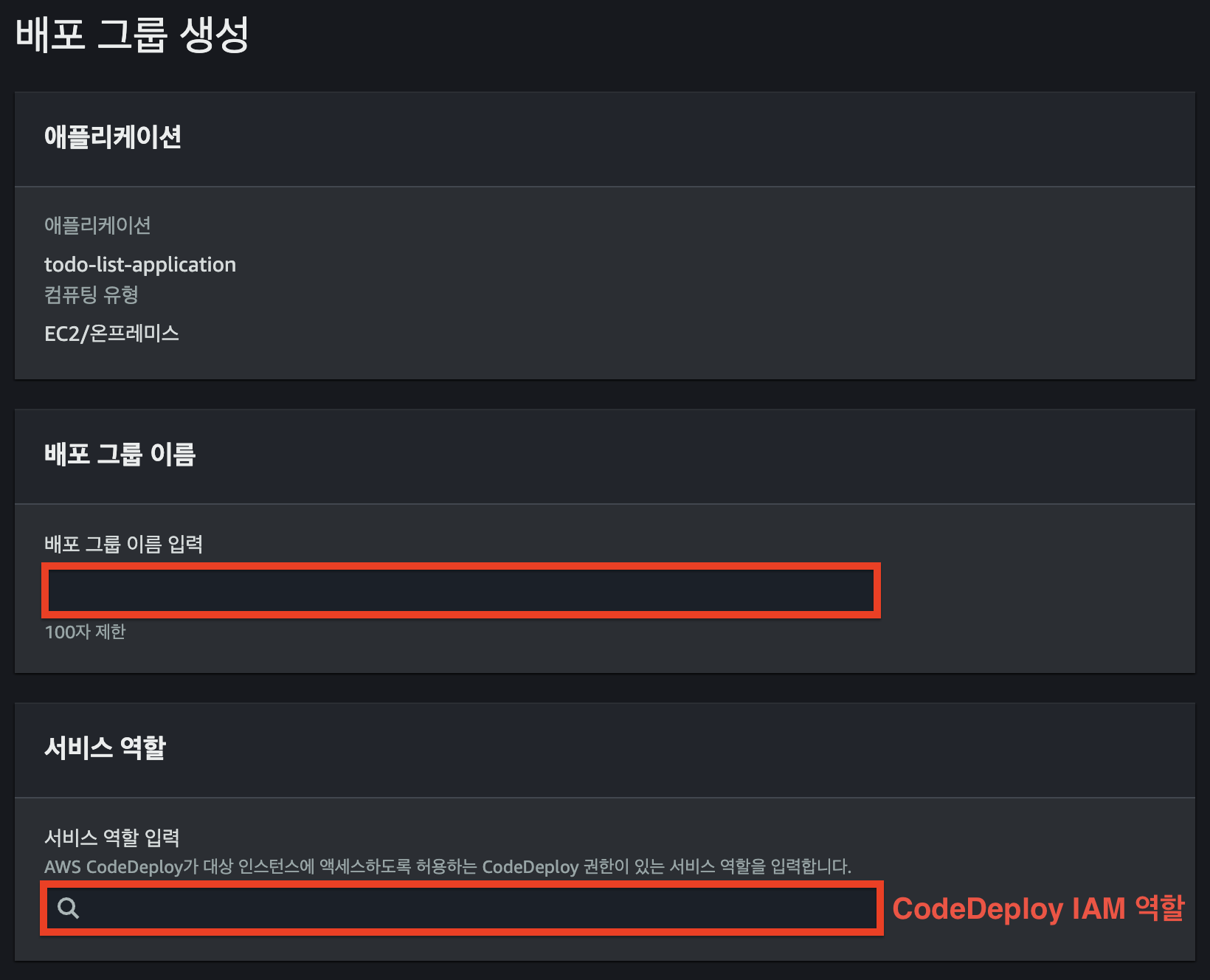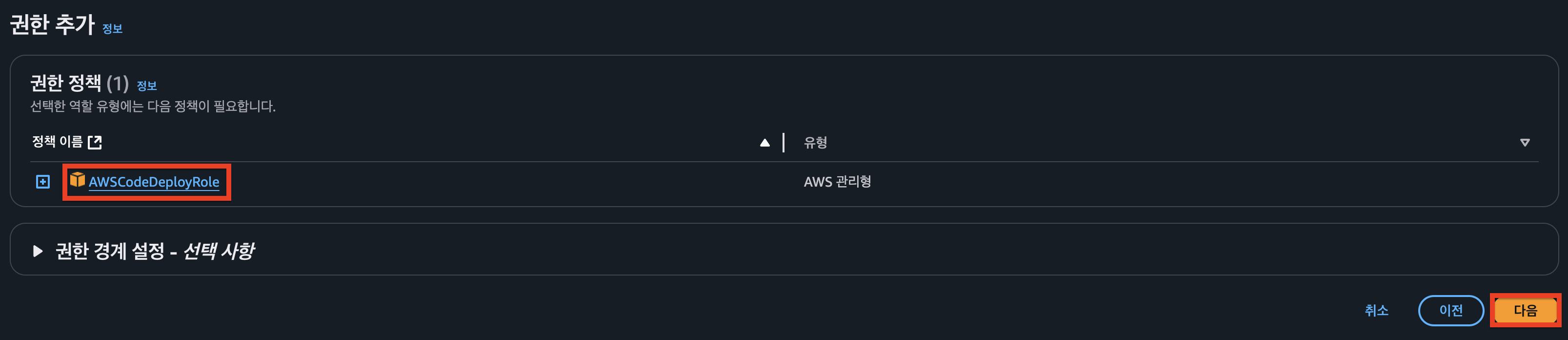 - `CodeDeploy` 역할에 필요한 권한을 부여합니다.