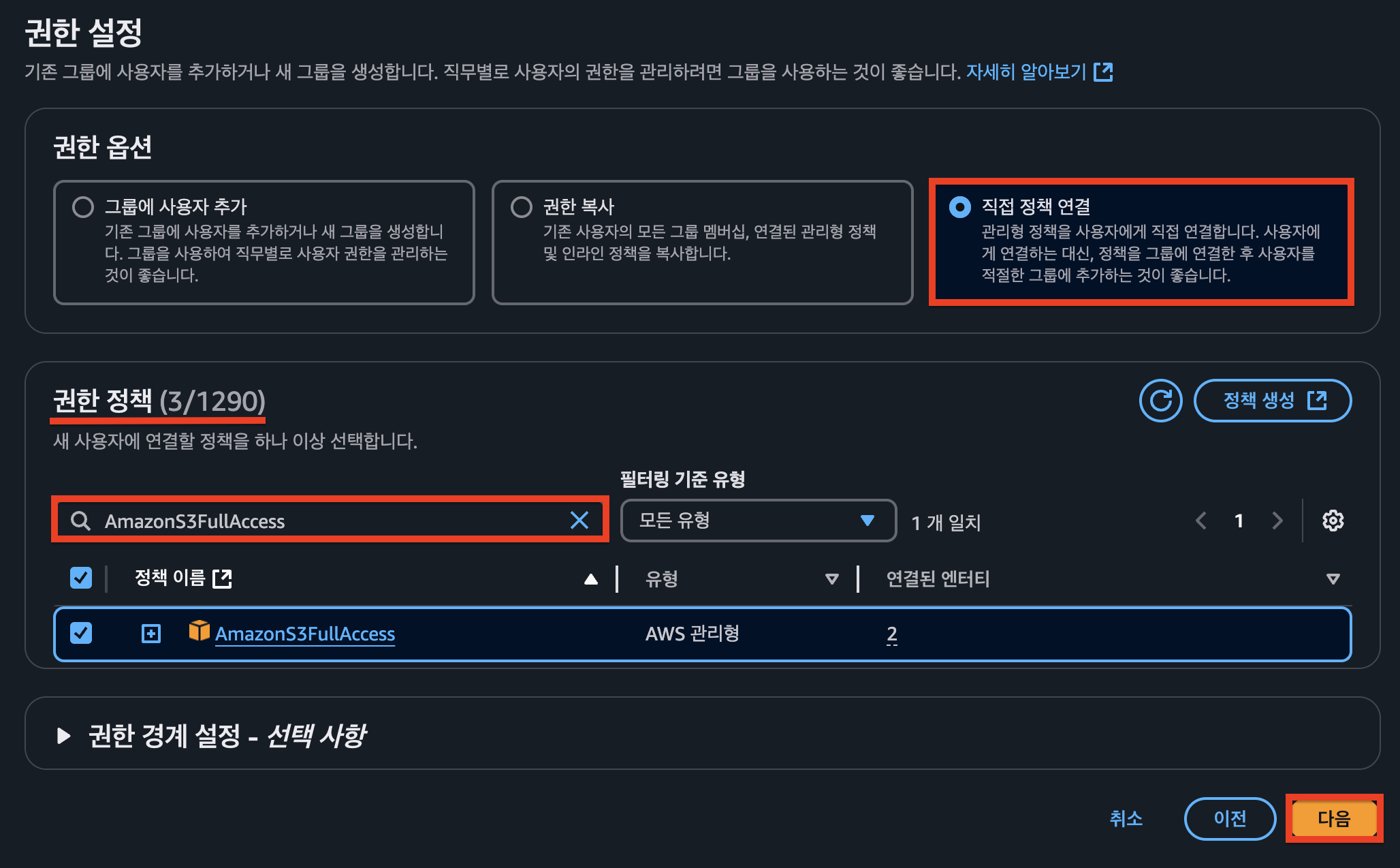 권한 설정 탭에서 `직접 정책 연결`을 선택하고 위의 3가지 권한을 추가합니다.