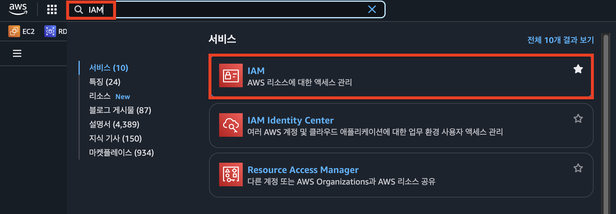 `좌측 상단 검색`을 통해 `IAM` 서비스로 이동합니다.