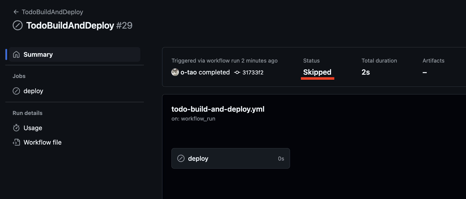 CI workflow 실패 시 CD workflow는 건너뛰어 실행되지 않는 모습을 볼 수 있습니다.