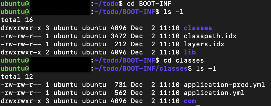 이후 `BOOT-INF` → `classes` 경로로 이동하면 yml 파일을 확인할 수 있습니다.