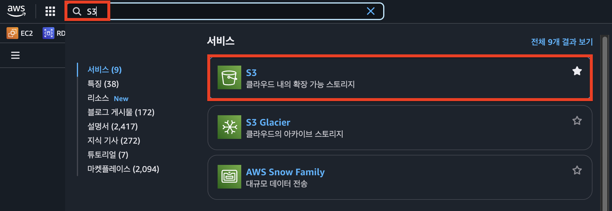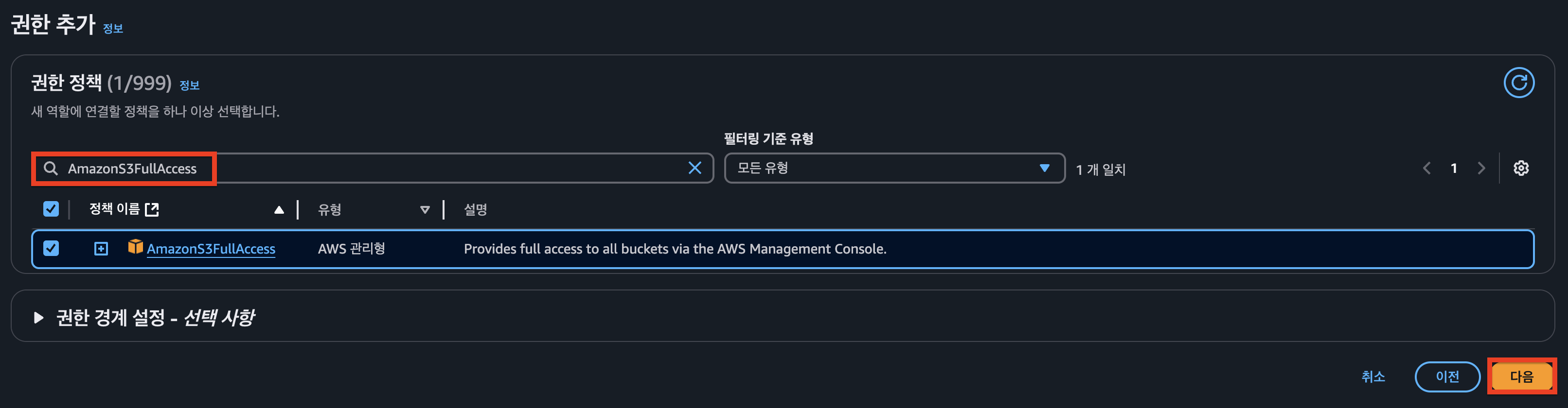 - `S3 서비스`에 대한 `전체 권한`을 부여합니다.
