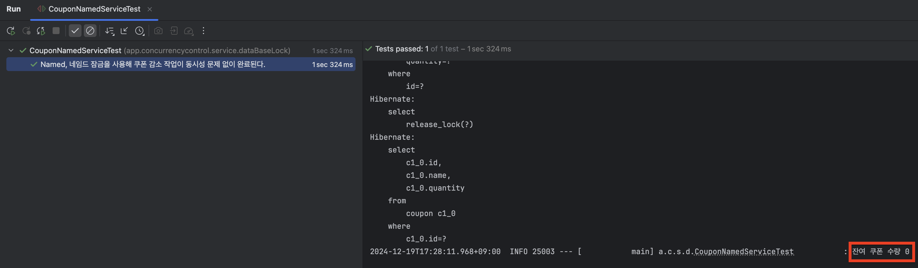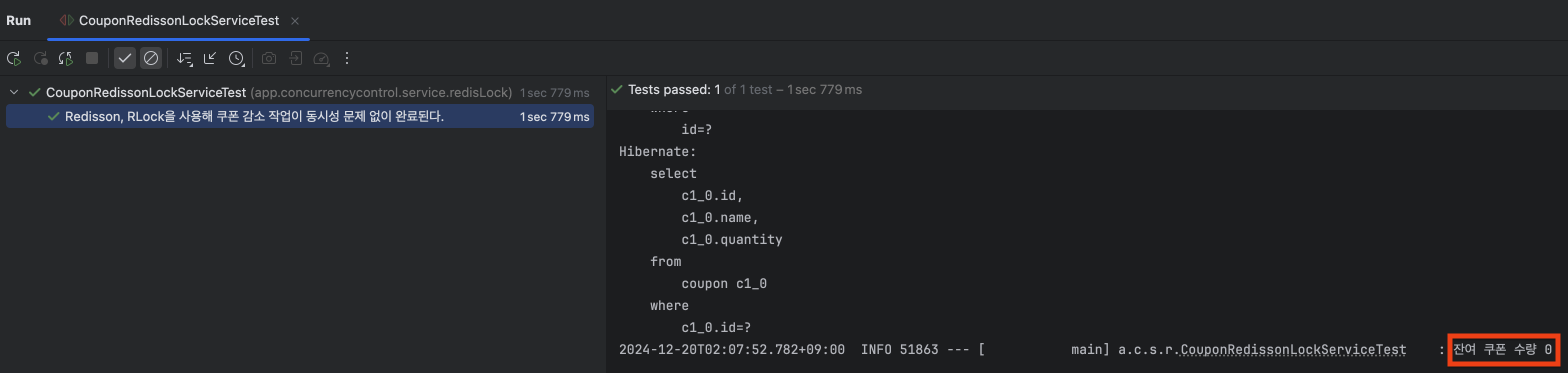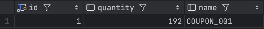 테스트 실행 시 정상적으로 쿠폰 수량이 감소하는 모습을 볼 수 있습니다.