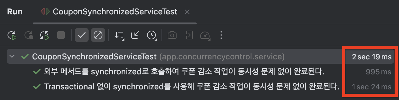 `Synchronized`블록 메서드를 생성하여 쿠폰 수량 감소 로직을 작성하였습니다.