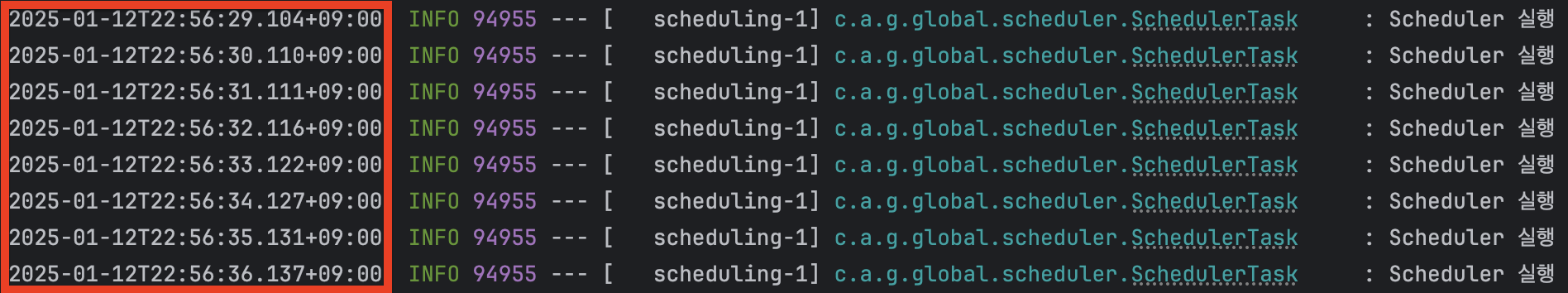 해당 클래스를 `Bean`으로 등록 후 애플리케이션을 실행하면 설정한 시간마다 실행되는 모습을 확인할 수 있습니다.