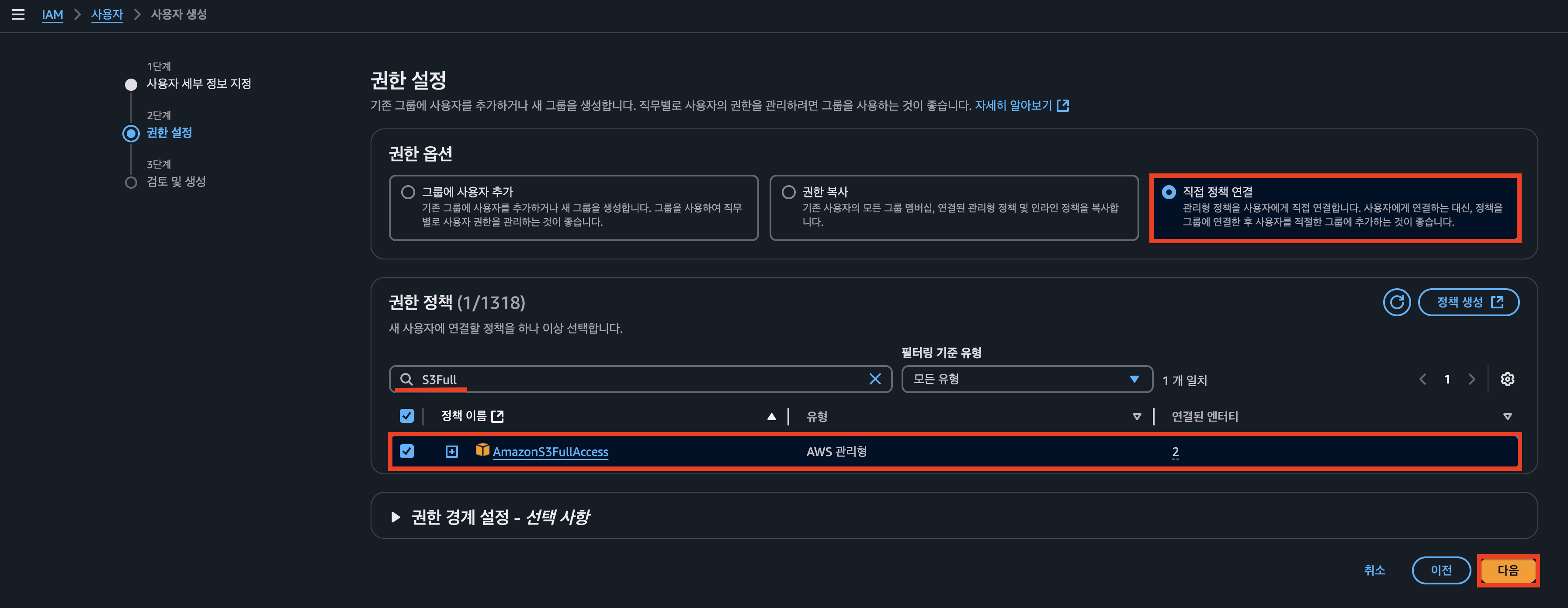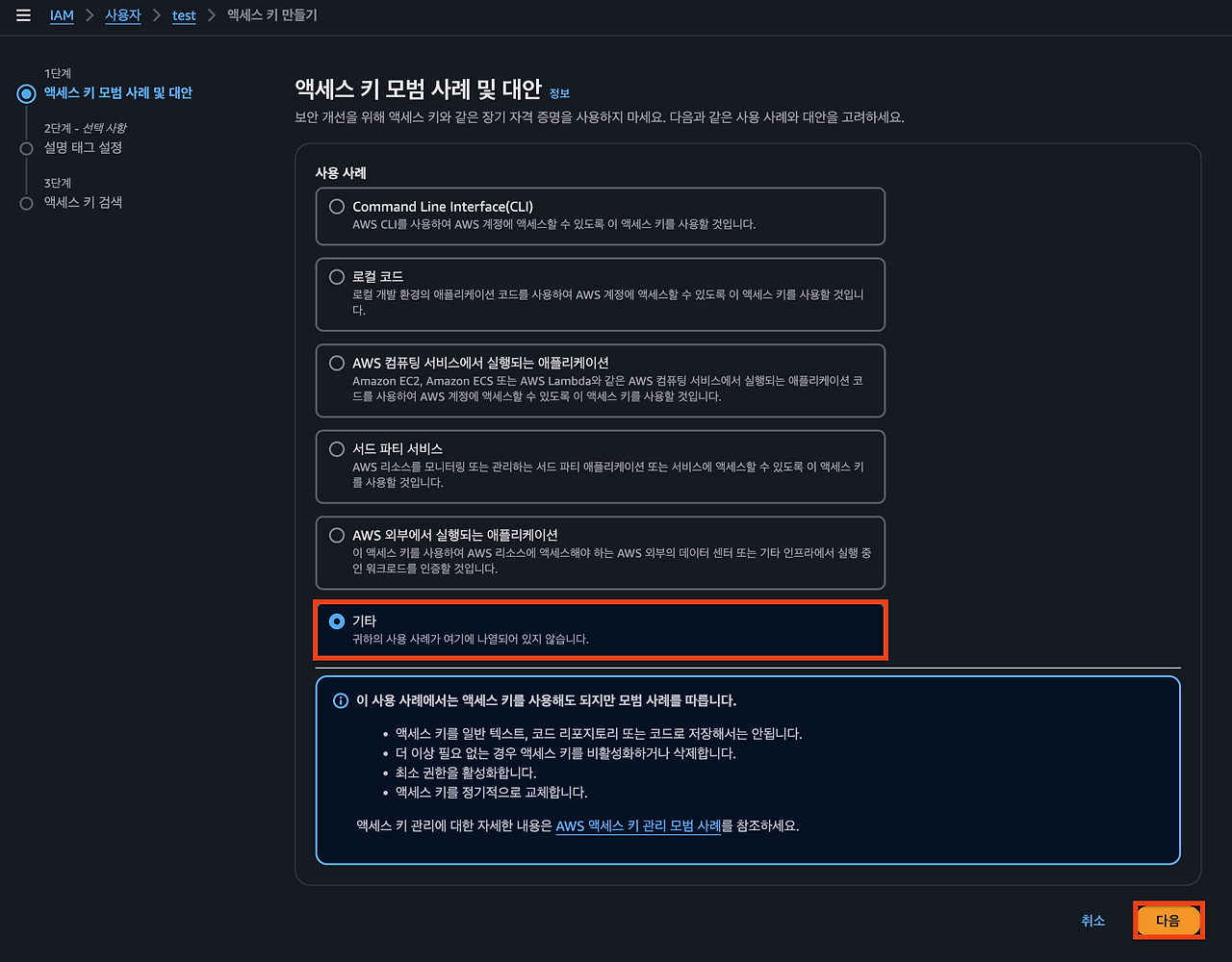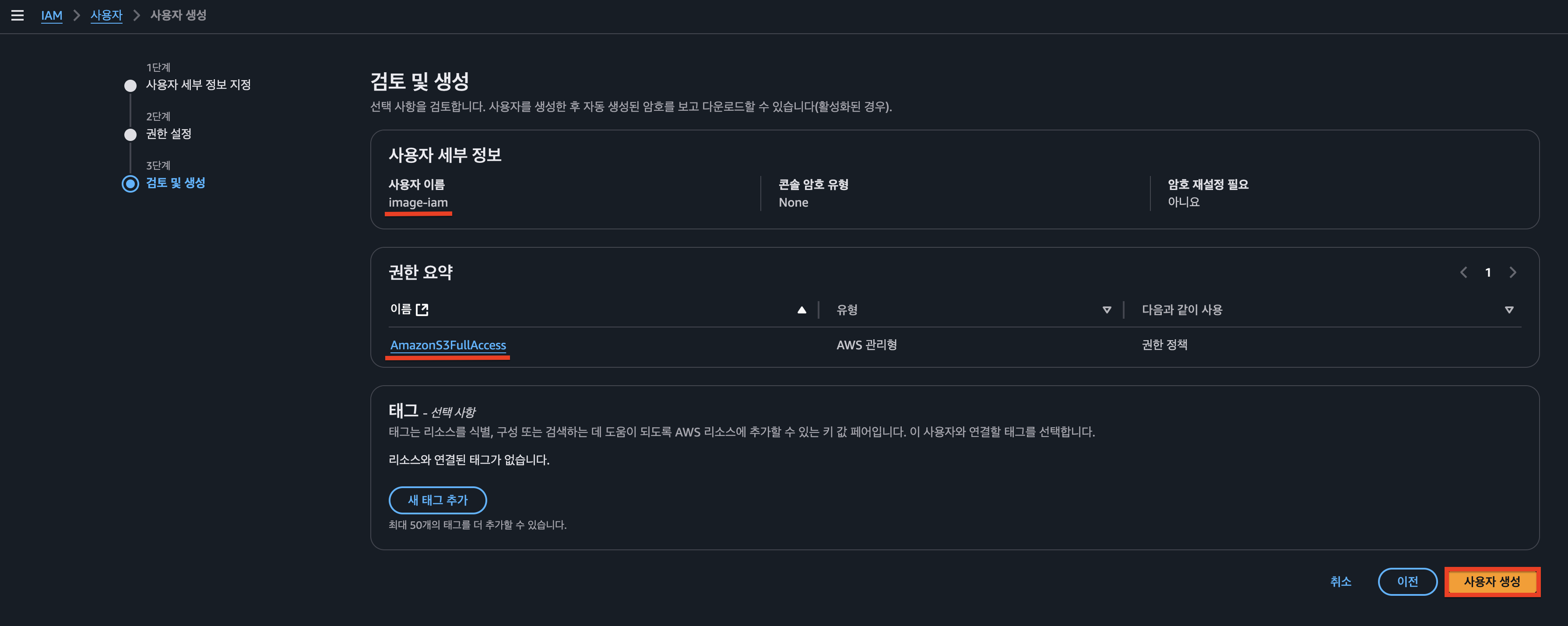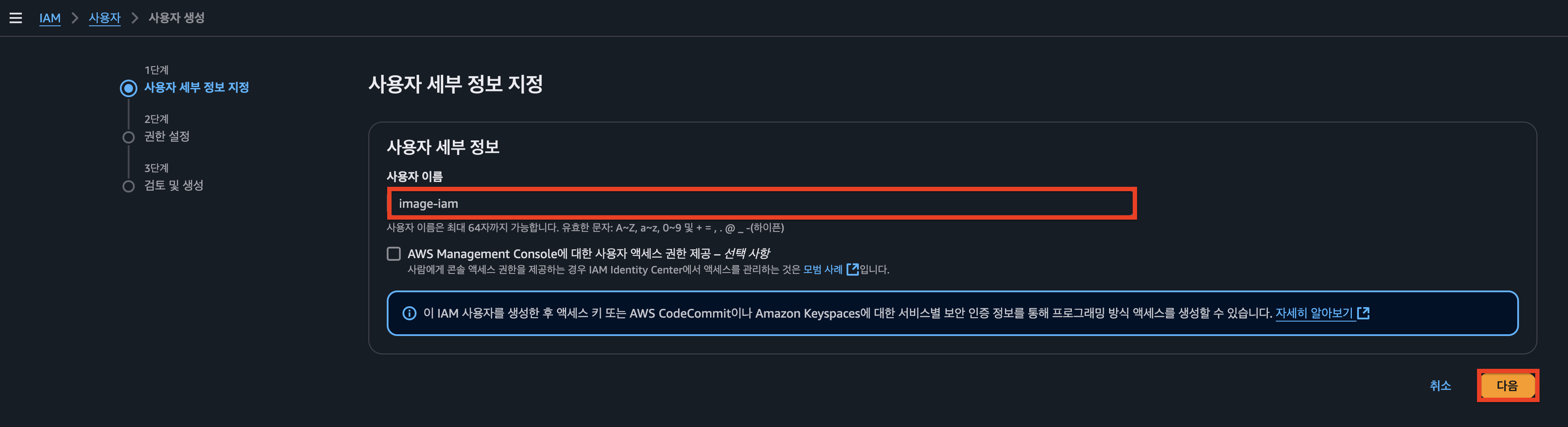 위의 과정을 따라 IAM 사용자를 생성합니다.