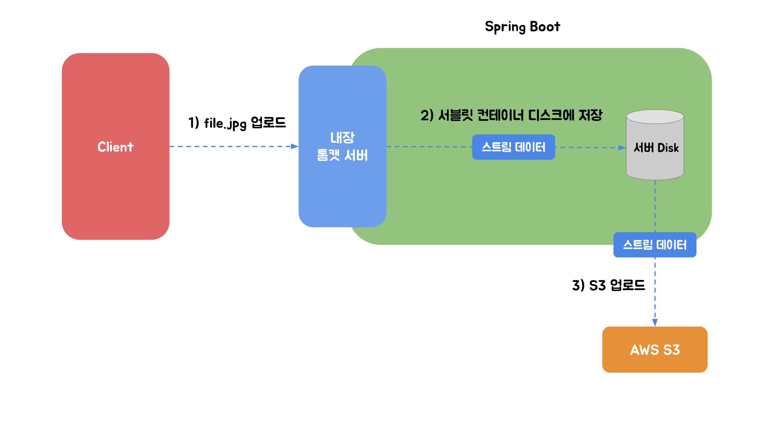 - 클라이언트 업로드: 클라이언트가 파일을 업로드하면 `AWS(Tomcat)`가 해당 파일을 설정된 임시 디렉터리 `location`에 저장합니다.