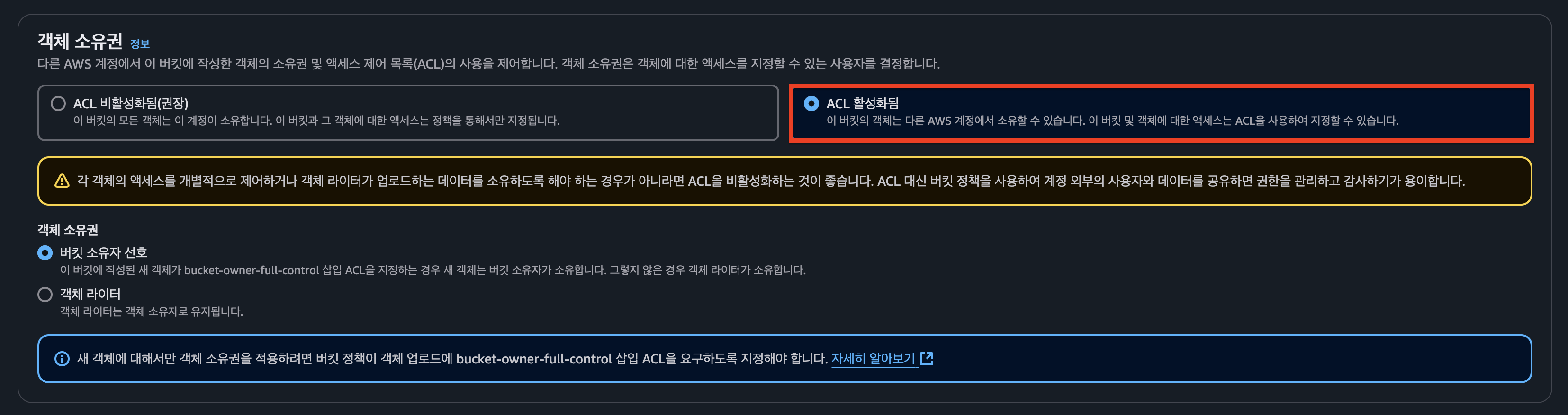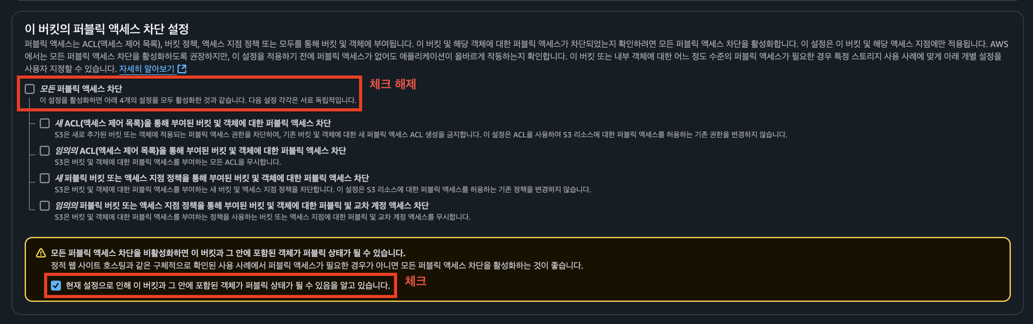 ACL 활성화 및 퍼블릭 액세스 차단 설정을 해제한 이유는 이후 ACL 설정으로 퍼블릭 읽기권한을 부여하기 위함입니다.