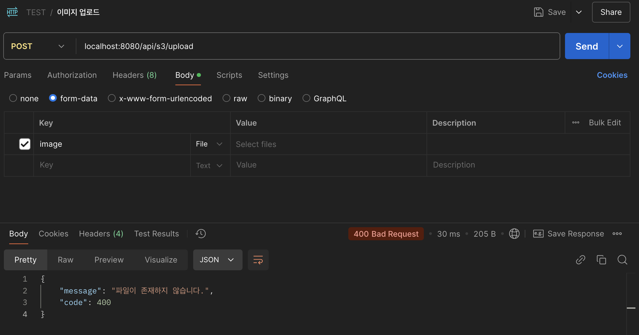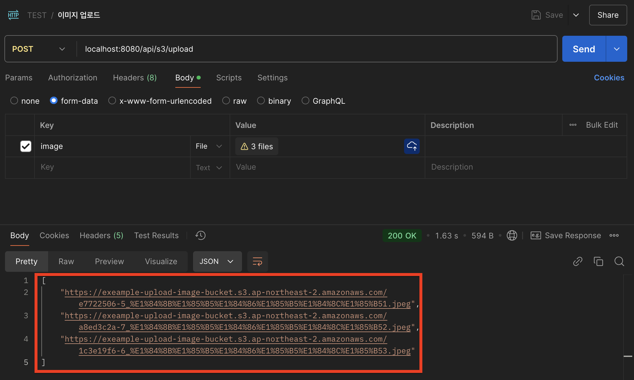 Postman을 통해 이미지 업로드 요청 시 S3에 정상적으로 객체가 생성되는 모습을 확인할 수 있습니다.