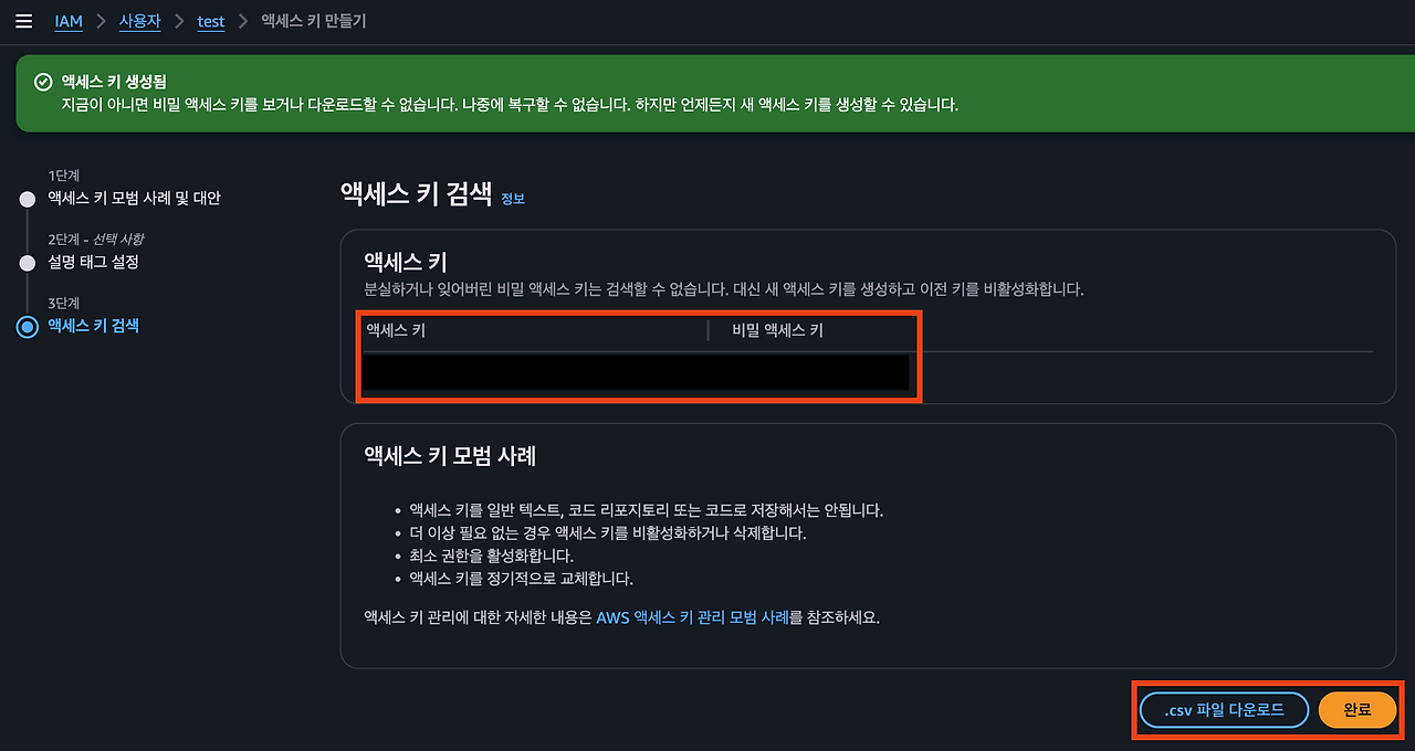 해당 페이지를 벗어나면 이후 액세스 키를 확인할 수 없어 새로 생성해야하니 잘 저장해두어야 합니다.