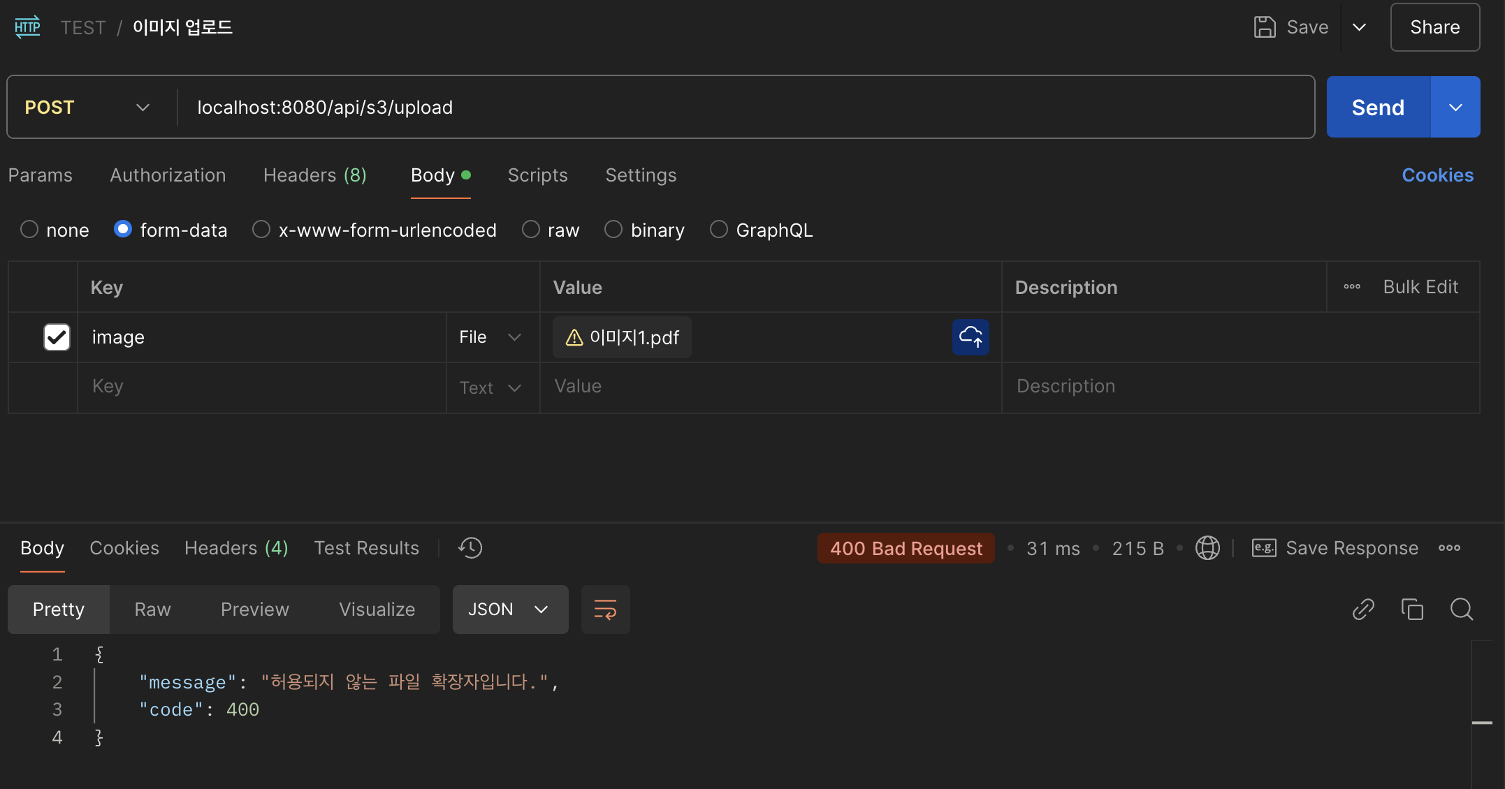 파일 존재 유무와 확장자에 대한 유효성 검증도 정상적으로 이루어지는 모습을 확인할 수 있습니다.