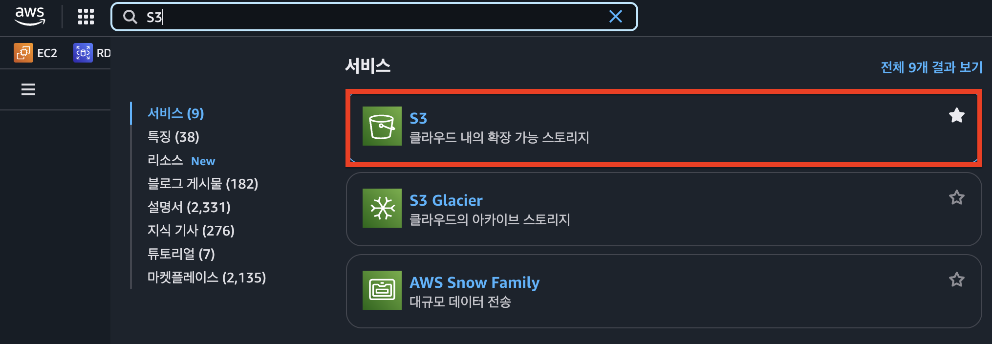 S3를 검색하여 이동 후 버킷 만들기를 클릭합니다.