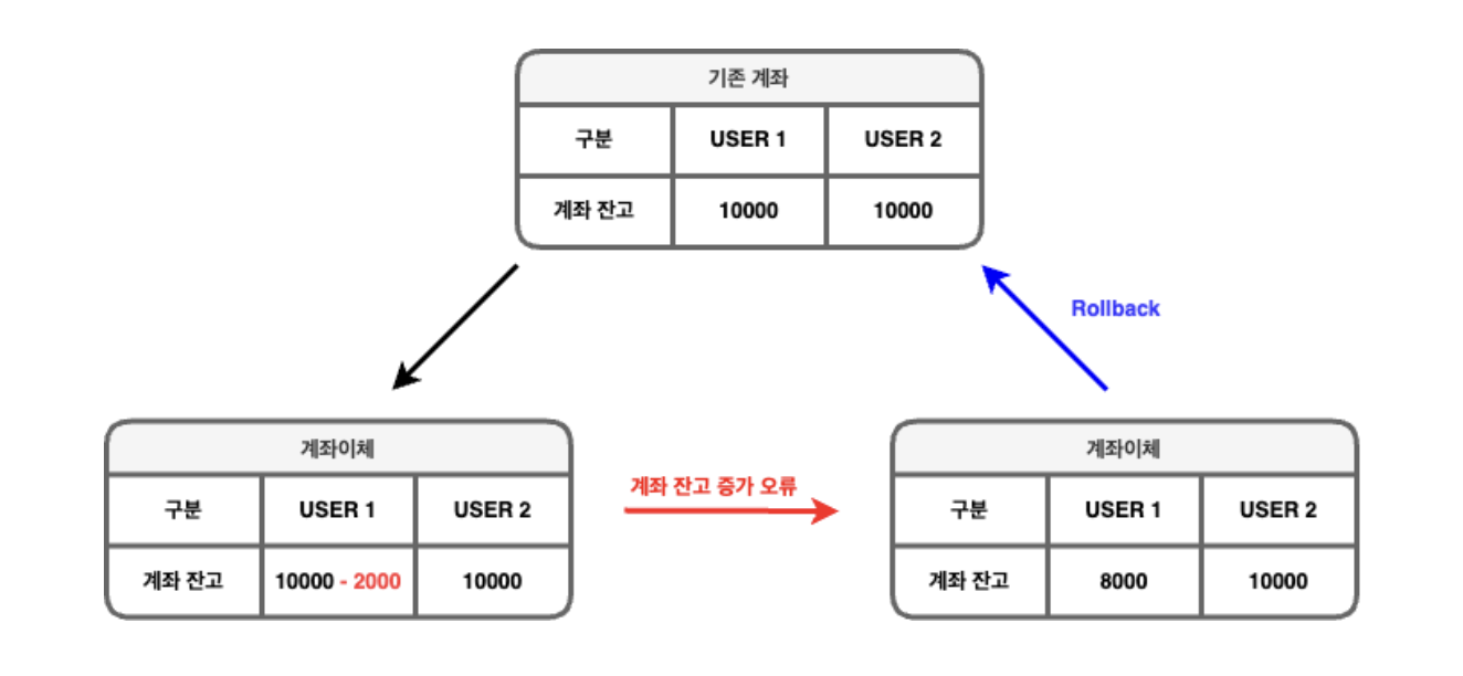 - 만약 `USER2`의 계좌에 금액을 추가하는 도중 오류가 발생하면, 트랜잭션은 롤백됩니다. 롤백을 호출하면 `USER1`계좌에서 차감된 금액도 되돌려지고, 두 계좌의 상태는 트랜잭션 시작 이전으로 되돌려집니다. 이는 데이터의 일관성을 유지합니다.