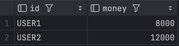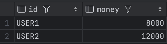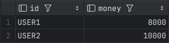 UPDATE accounts SET money = money + 2000 WHERE id = 'USER2'; -- 금액 추가