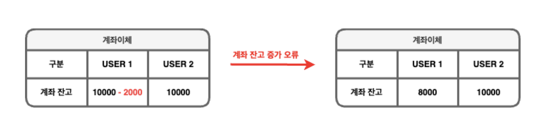 즉, `USER1`의 계좌는 이미 금액이 감소했지만, `USER2`의 계좌에는 증가된 금액이 반영되지 않은 상태로 저장되어 치명적인 문제로 다가오게 됩니다.
