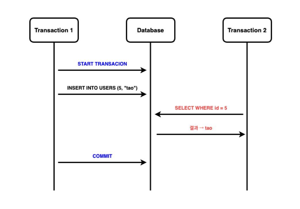- 데이터 삽입을 예로 했을 때, `트랜잭션1`에서 커밋하기 전 `트랜잭션2`가 조회 시 아무 데이터도 확인할 수 없는데 `트랜잭션1`커밋 후에는 `트랜잭션2`가 조회 시 생성된 데이터를 확인할 수 있습니다. `트랜잭션2`입장에서는 이전에 없던 데이터가 조회 시 갑자기 나타난 상황인데 위와 같은 상황으로 다른 트랜잭션의 커밋 여부에 따라 데이터 존재 유무가 달라지게 되는데 이를 `Phantom Read`라고 합니다.