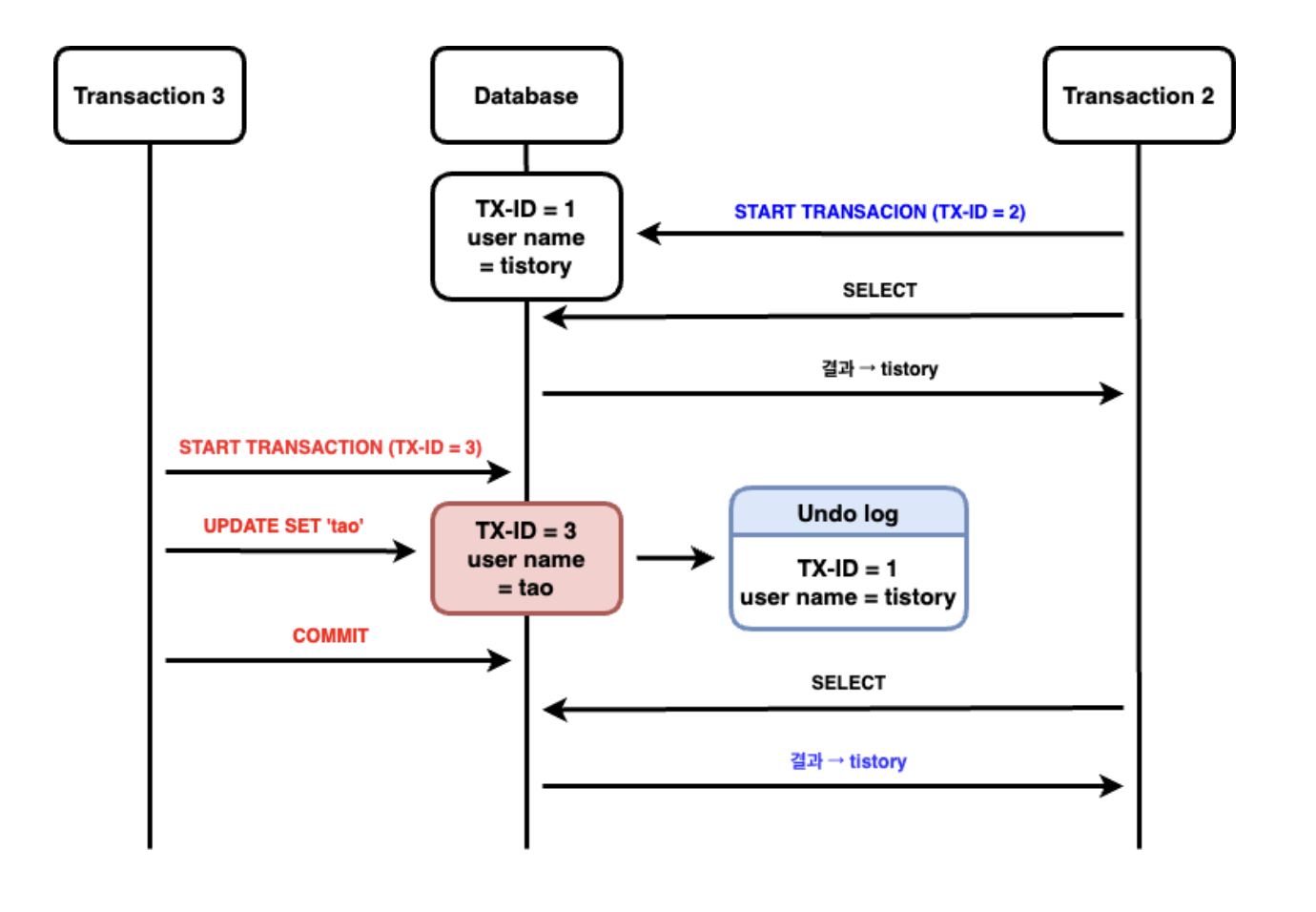 한 트랜잭션에서 데이터 변경 시 커밋하기 전 다른 트랜잭션에서 이를 조회 시 실제 테이블 값이 아닌 Undo 영역에 백업된 레코드 값을 가져오게 됩니다. 하지만 하나의 트랜잭션에서 같은 select 쿼리를 실행했을 때 항상 같은 결과를 가져와야 하는 REPEATABLE READ의 정합성에 어긋나며, Non-Repeatable Read (반복 읽기 불가능) 문제가 발생합니다.