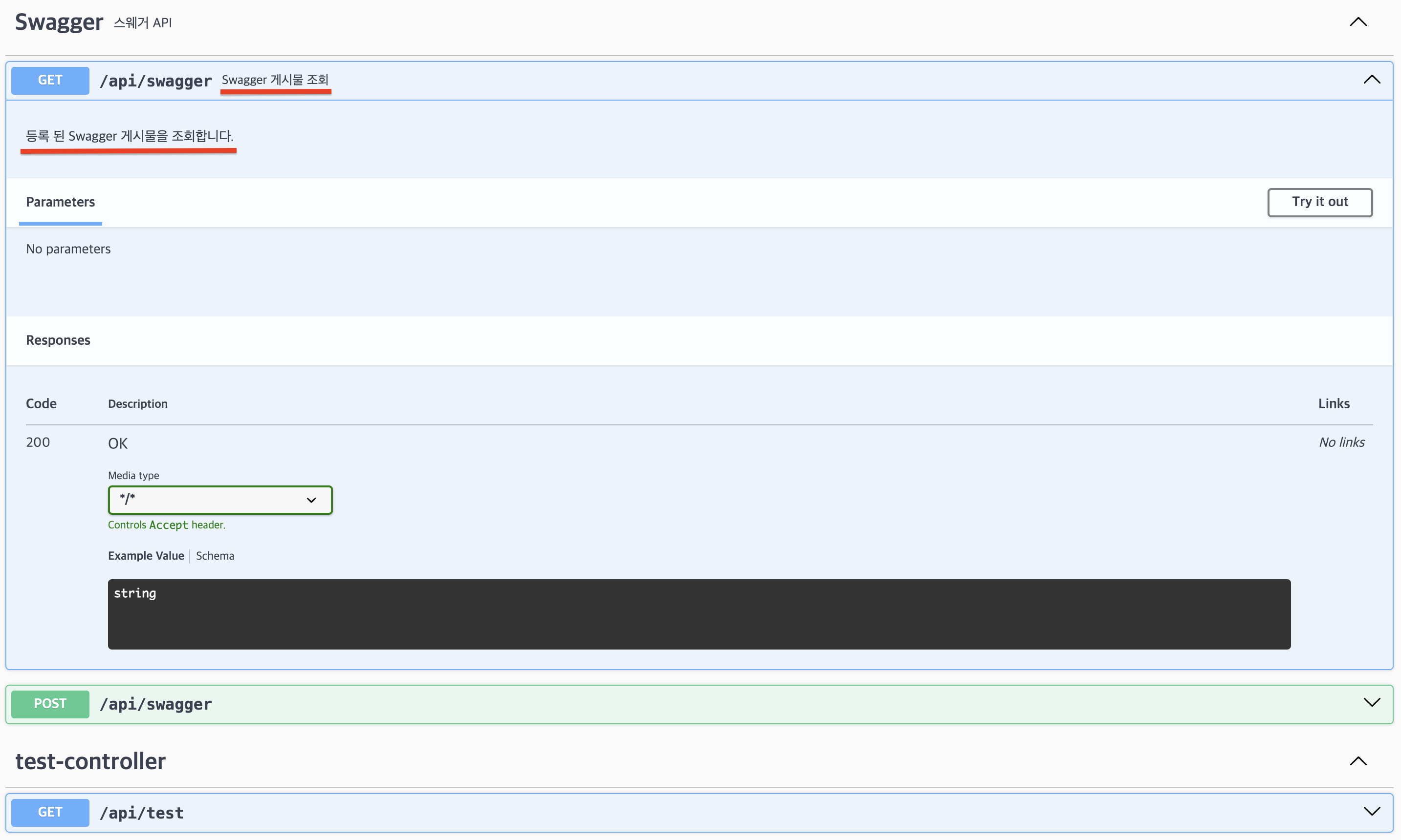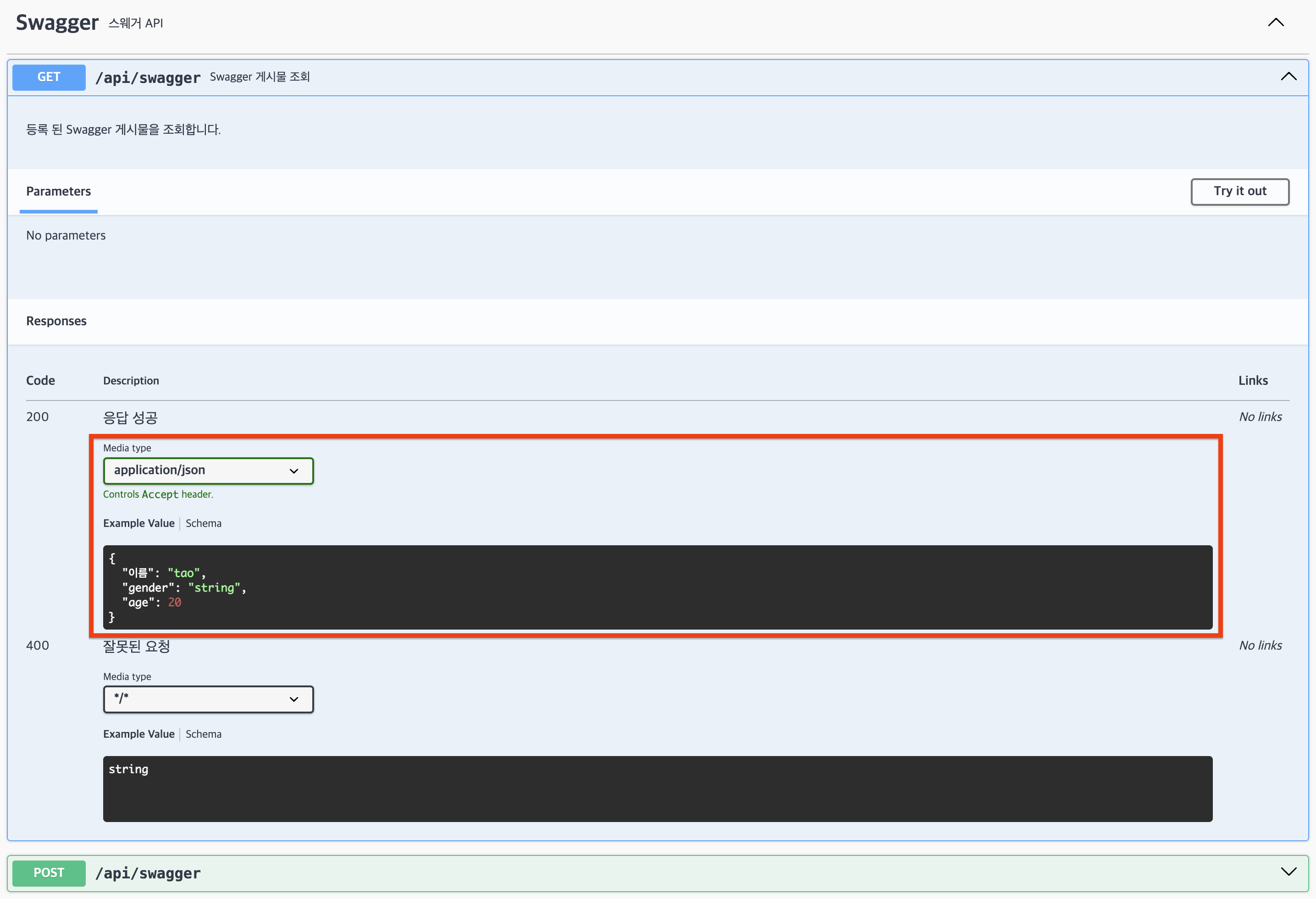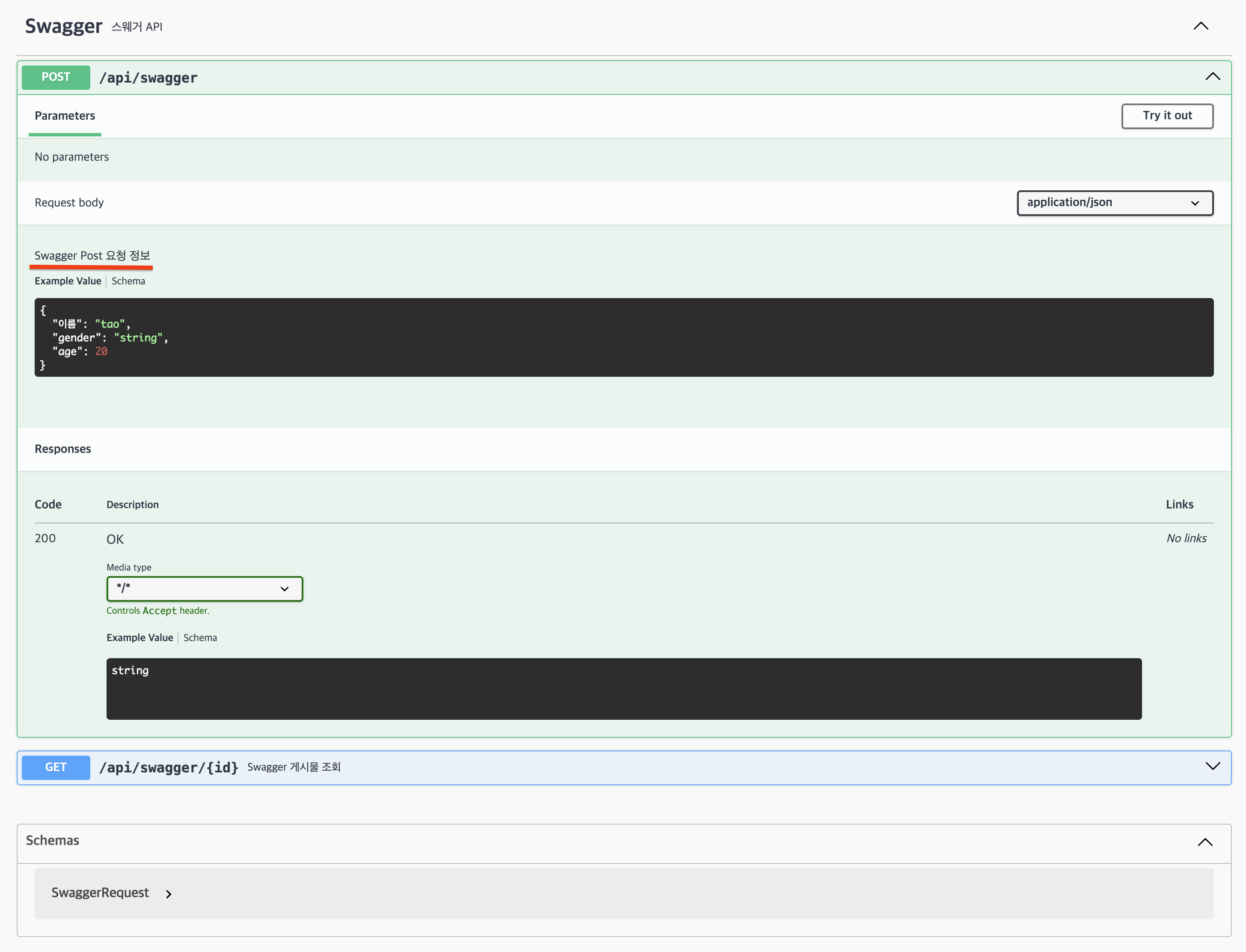 `SwaggerController` 클래스는 `/api/swagger` 경로로 들어오는 `GET, POST` 요청을 처리하는 예시코드입니다.