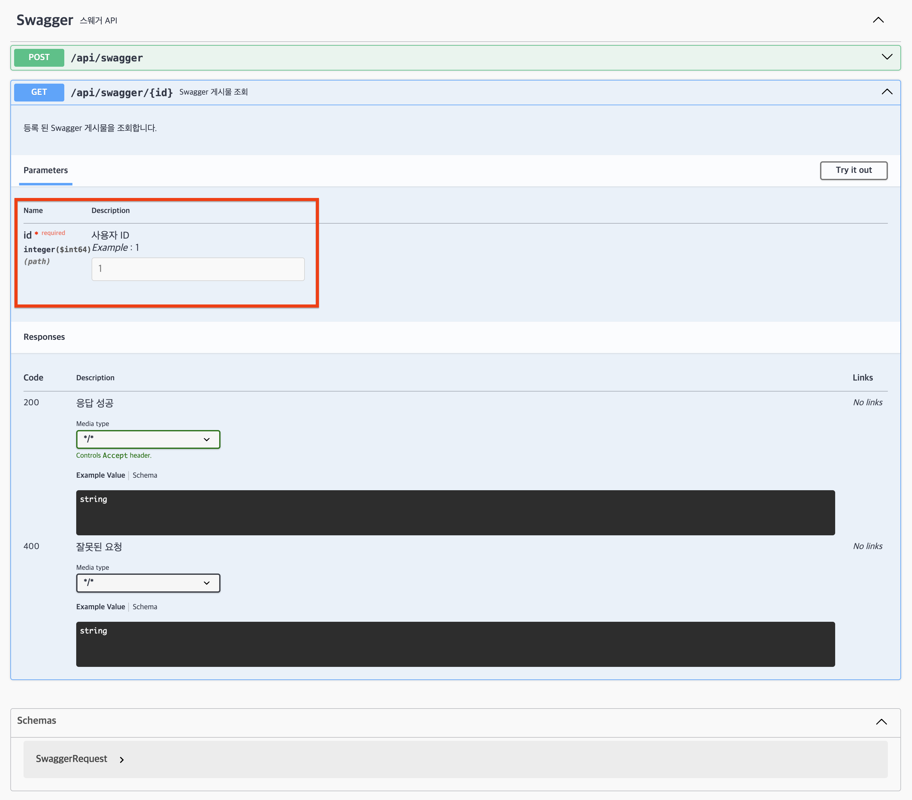 `SwaggerRequest` 클래스는 RequestBody 값을 표현하기 위한 예시 클래스 입니다.