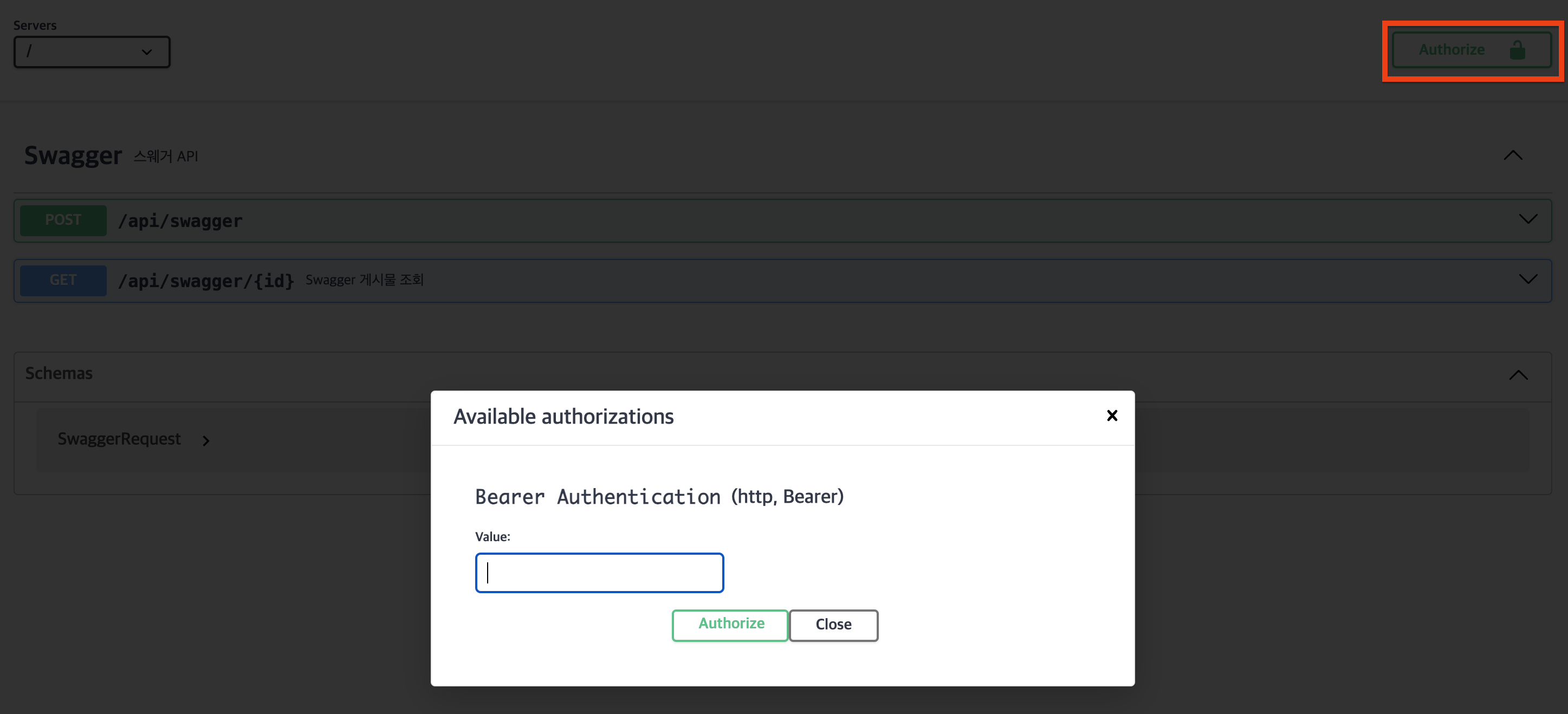 @SecurityScheme 설정 후 우측 상단에 `Authorize` 버튼이 생성되고 로그인 시 응답되는 `토큰, 세션 키 등을 입력`하면 API를 인증된 상태로 테스트할 수 있습니다.
