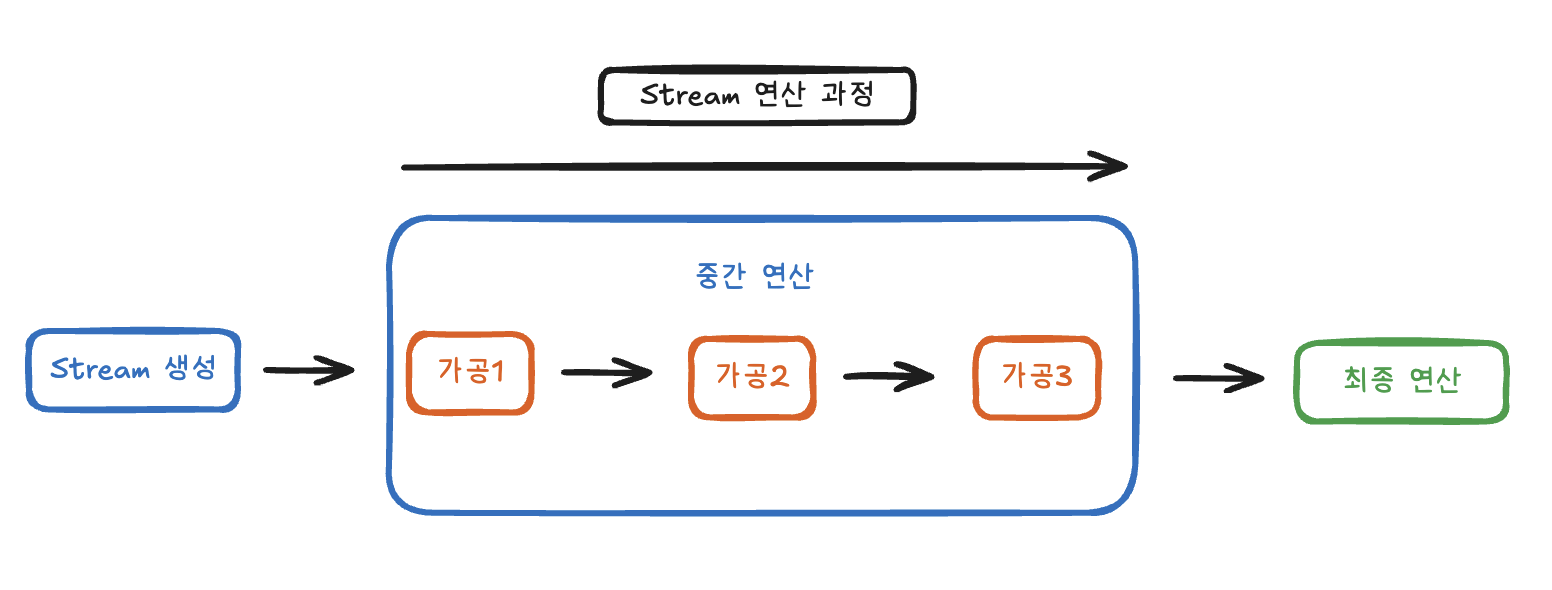 Stream은 데이터를 처리하기 위해 데이터를 생성하고, 생성된 데이터를 가공하여 필요한 형태로 변환 후 최종적으로 결과를 소비합니다.