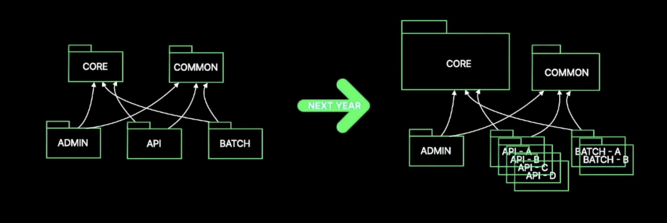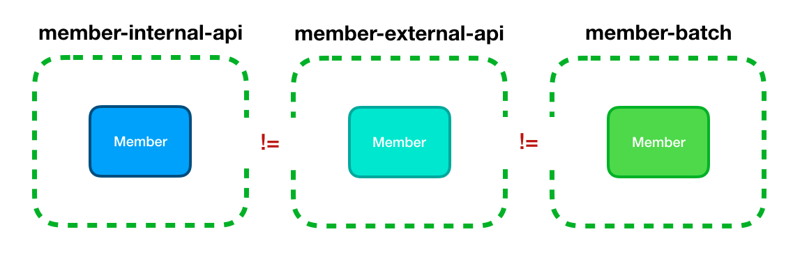 - `중복 코드에 대한 휴먼 에러`: 같은 도메인에 대해 별도의 여러 프로젝트로 구성되어 있어 중복되는 코드가 많이 발생하게 됩니다. 예를 들어, Member 도메인 모델에 대한 코드를 Member API, Member Admin, Member Batch 프로젝트에 모두 작성해 주어야 하며, Service, Repository도 마찬가지입니다. 이런 구조에서 요구사항이 변경된다면, 3개의 프로젝트에 작성된 공통 코드를 모두 변경해주어야 합니다.