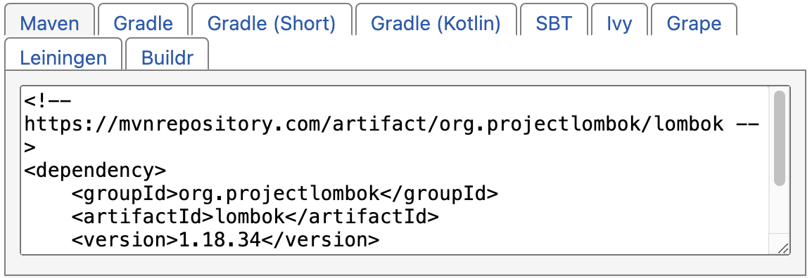 Maven Repository 사이트에 접속 → lombok 검색 → Project Lombok → 버전 선택 후 Dependency 복사