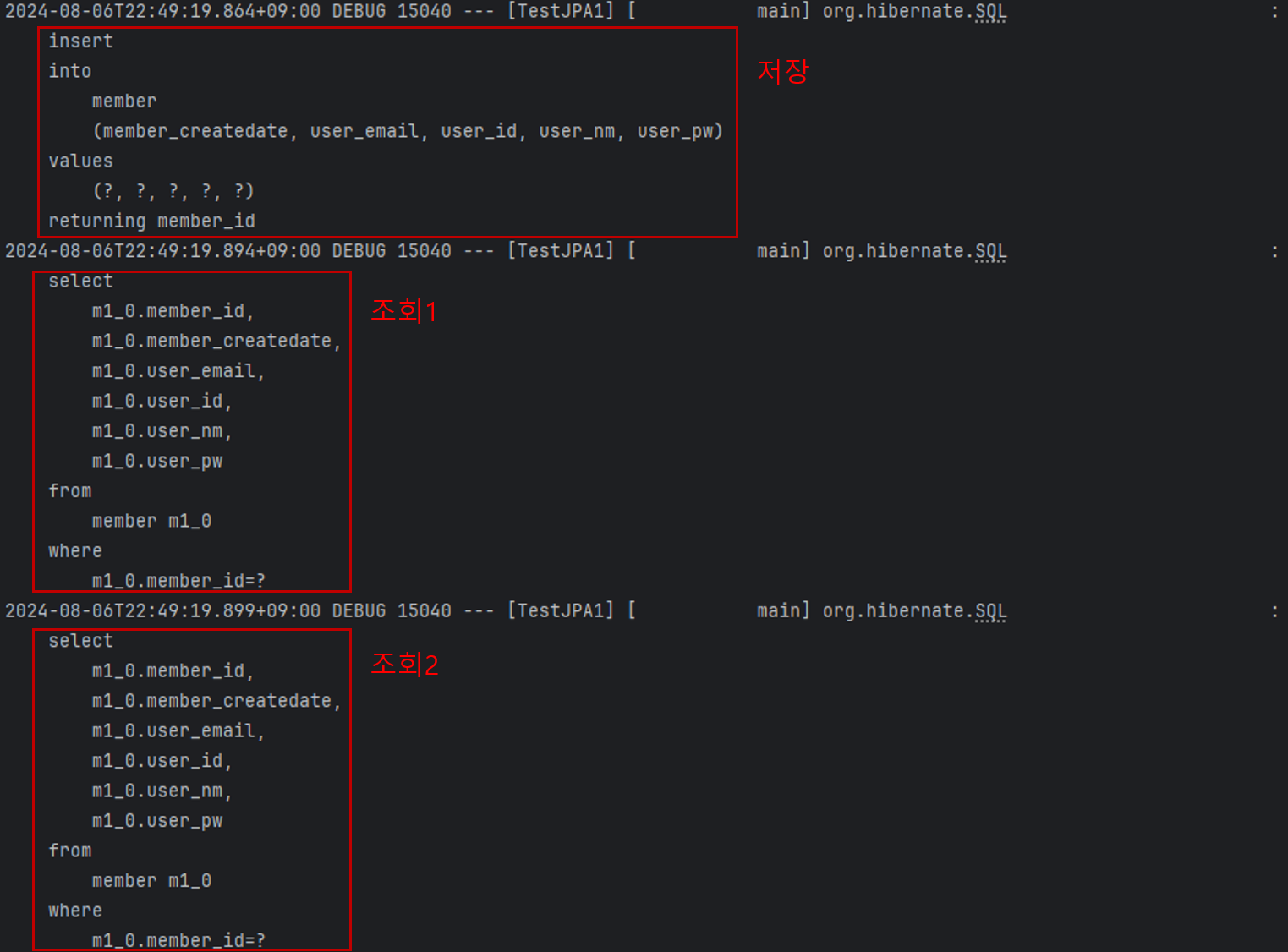 member객체를 저장할 때 DB에 접근 후 영속성컨텍스트에 저장되고 그림에서의 설명과 같이 1차 캐시에서 조회 후 반환되어 뒤의 member객체 조회 시 DB접근 없이 실행되는 것을 확인할 수 있다.