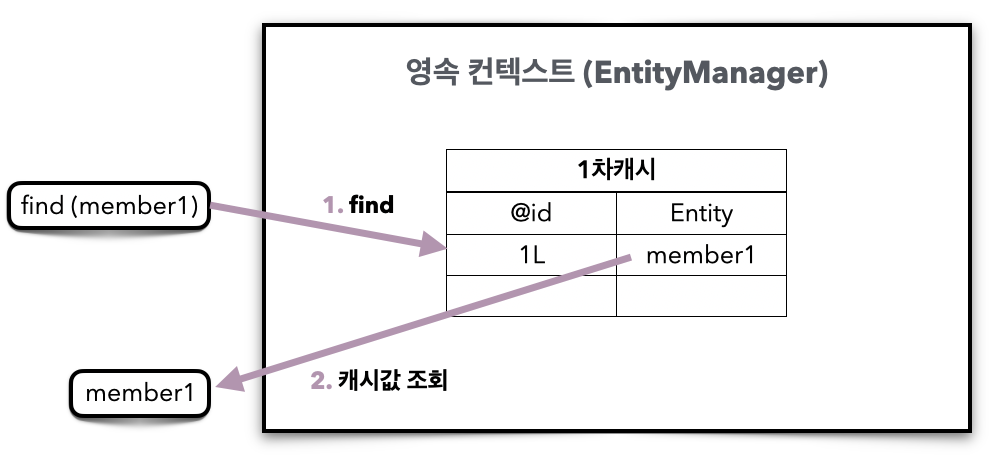 - 영속성 컨텍스트 내부에는 엔티티(Entity)를 보관하는 저장소가 있는데 이것을 1차 캐시라고 한다.