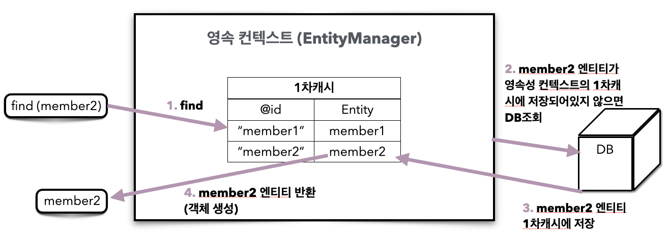 DB를 조회하고 조회한 엔티티를 1차 캐시에 저장 후 해당 엔티티를 반환해 준다.
