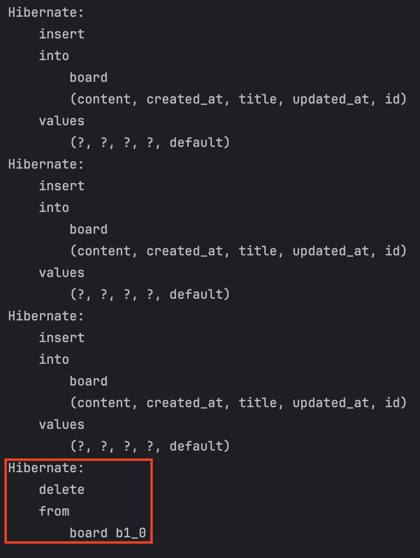 // deleteAll을 사용하였을 경우 동작 쿼리를 확인하기 위한 임시 Test 코드